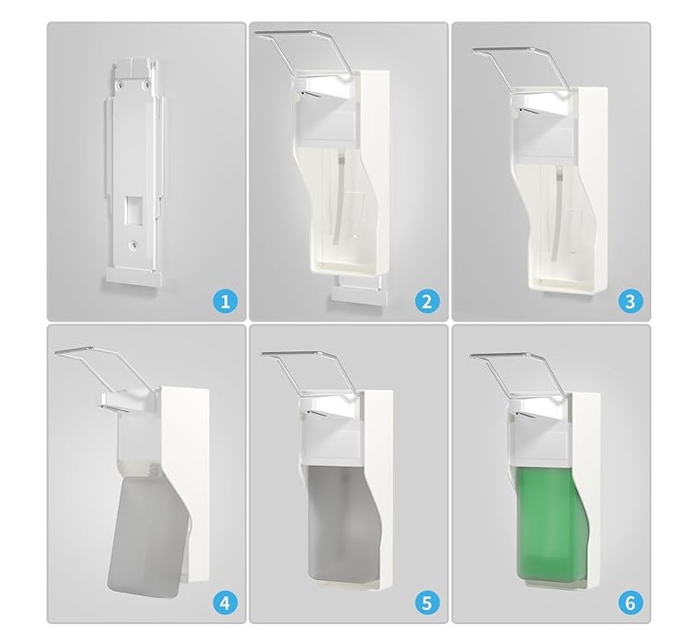 Настінне кріплення: Як показано на малюнку, настінний дозатор мила можна легко встановити на стіну за допомогою кріплення, що входить до комплекту поставки. Крім того, прозора пляшка для дозування дозволяє легко спостерігати за витратою рідини в контейнері і полегшує своєчасну заміну