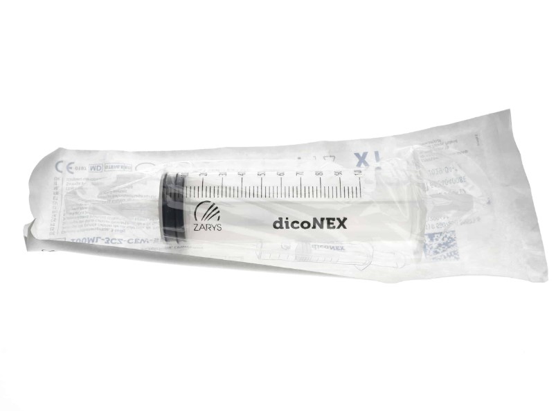 Трикомпонентний шприц з центральним конусом для катетера і двома люерними з’єднувачами, виготовлений з поліпропілену. Виріб з прозорим циліндром, отвором для запобігання випадковому вислизанню прозорого плунжера та подвійним кільцевим ущільненням на пробці. Прозора чорна шкала для легкого дозування, градуйована з кроком 2 мл, конус зі скосом 45°. Одноразові, без латексу і фталатів, стерилізовані етиленоксидом, призначені для збору, введення ліків/рідин пацієнту і збору зразків біологічних рідин у пацієнта.