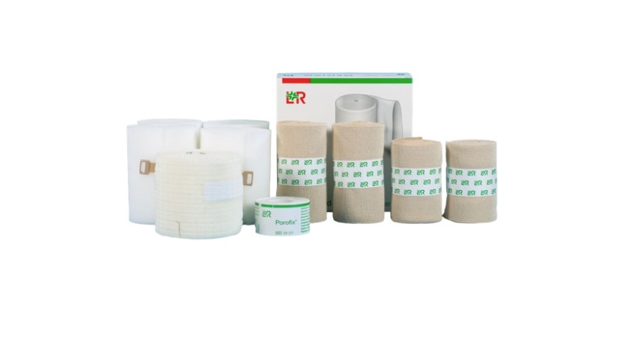 Набір перев’язувальних матеріалів для компресійної терапії Rosidal sys – це велика упаковка готових до використання бинтів і пов’язок.